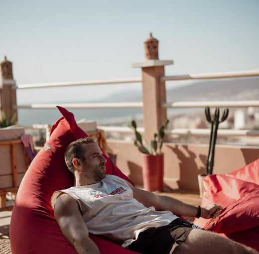 Flo Surf Morocco’s surf house offers a harmonious mix of traditional Moroccan charm and modern comfort. Nestled in the heart of Tamraght, guests can choose between cosy private rooms or sociable shared spaces, all designed with relaxation in mind. After a day on the waves, unwind in the peaceful setting, enjoy the rooftop terrace with stunning ocean views, or mingle with fellow surfers in the communal areas.